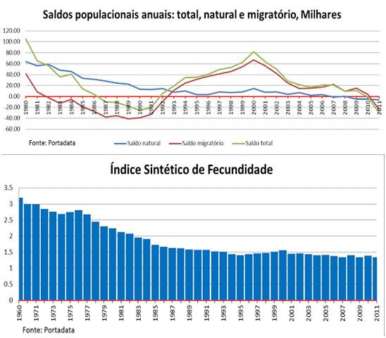 Mas os últimos dados demográficos de Portugal estão mostrando que tanto o saldo vegetativo quanto o saldo migratório foram negativos em 2010 e 2011. Reportagem de Patricia Mello da Folha, de 11 de agosto de 2013, mostra que Portugal pode perder 1 milhão de habitantes (10% da população) em 10 a 20 anos. Cerca de 100 mil portugueses emigram por ano desde 2010, o número de óbitos está 6 mil acima do número de nascimentos e a taxa de fecundidade está em 1,3 filho por mulher. Sem perspectiva econômica, dificilmente a situação demográfica vai melhorar, sendo que a crise demográfica agrava a crise econômica. Portugal está em um “ciclo vicioso” e em uma espiral de decrescimento.