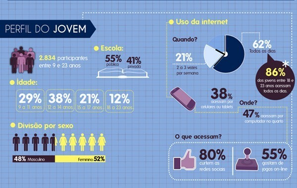 Dos 2834 jovens entre 9 e 23 anos que participaram da pesquisa, 62% afirmam que usam a internet todos os dias. O número cresce para 86% entre os jovens de 16 a 23 anos. As redes sociais são a atividade preferida por 80% dos participantes, seguida por ouvir músicas e assistir filmes (57%) e jogar jogos (55%). Celulares e tablets ocupam o segundo lugar na lista dos dispositivos mais utilizados para o acesso, com 38%, atrás apenas dos computadores no quarto, usados por 47%.