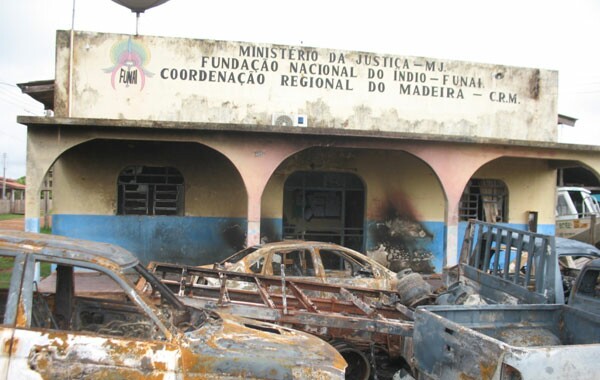 Cena 5. O ano de 2014 começa e a entrada da sede da Funai, em Humaitá, continua sob escombros. Um funcionário trabalha como porteiro de ninguém, em meio aos vidros e pedaços de carro. À frente, os dez veículos da fundação destruídos, queimados no início da noite de Natal. Nas carrocerias, restaram apenas os botijões de gás para contar a história. Os vizinhos contam que o momento mais tenso foi quando houve explosões, em meio aos coquetéis molotov e os tanques de gasolina dos carros destruídos. “Não tinha como não chorar”, conta Claudinei, morador da casa ao lado. “Queriam invadir por aqui”, completa Maria, sua mulher, em pânico por causa das crianças. Ao lado da Funai, no estacionamento, uma voadeira e três motos: todas queimadas. Diante do cordão formado pelos policiais, os manifestantes atiravam pedras e rojões e jogavam as garrafas com gasolina nos carros. O comandante do 54º Batalhão de Infantaria da Selva mandou fechar os postos de combustível para deter os incêndios. Motoqueiros, porém, ofereciam o que tinha em seus tanques. Um caminhão-pipa do Exército estava por ali. “Mas não tinha como chegar”, lembra Claudinei. O prédio se salvou, mas os funcionários da Funai tiveram de fugir para Porto Velho. A perícia? A perícia ainda não foi feita. O local do crime ainda não foi isolado.