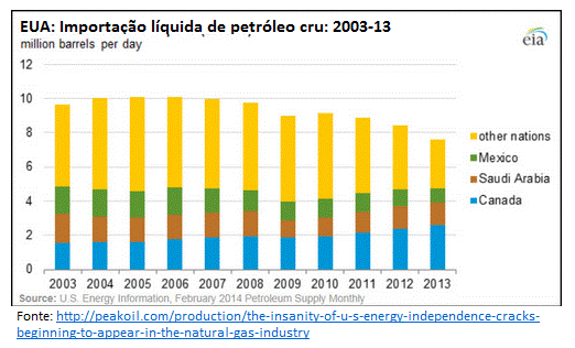 A importação líquida de petróleo cru estava em torno de 10 milhões de barris por dia (mbd) até 2007 e caiu para cerca de 7 milhões de barris dia em 2013. Só para ter uma ideia a produção brasileira foi de cerca de 2 milhões de barris dia em 2013. Ou seja, os EUA ainda importam mais de 3 vezes toda a produção brasileira de petróleo cru. Portanto, a importação está diminuindo, mas está longe de chegar à independência energética