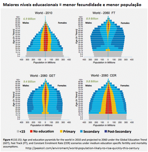 Toda a literatura demográfica mostra que existe uma relação inversa entre educação e fecundidade. O grande desafio é avançar com os anos médios de estudo. A dificuldade é sair da “armadilha da pobreza” e da falta de orçamento e capacidade de gestão dos países do chamado Terceiro Mundo, especialmente dos chamados “Estados falidos”. Universalisar o acesso ao ensino fundamental é uma tarefa muito dificil nos países de baixa renda. Universalisar o ensino médio é mais dificil ainda. Garantir qualidade na educação é outra tarefa que exige grande esforço. Por outro lado, a queda da fecundidade ajuda no processo de expansão educacional, pois menor número de filhos por família e coortes menores tendem a aumentar o investimento per capita em educação.