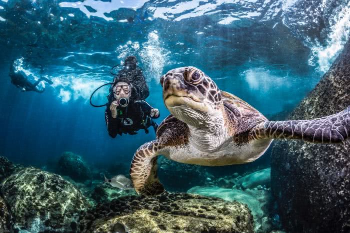 A operadora de mergulho Búzios Divers leva entusiastas para fazer um batismo de mergulho com as tartarugas marinhas, que deixam os mergulhadores se aproximarem bastante. |