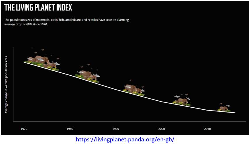 Enquanto a população humana passou de 3,5 bilhões para cerca de 7,5 bilhões de habitantes, as populações de vertebrados silvestres, como mamíferos, pássaros, peixes, répteis e anfíbios, sofreram uma redução de 68% entre 1970 e 2016, conforme mostra o gráfico abaixo.