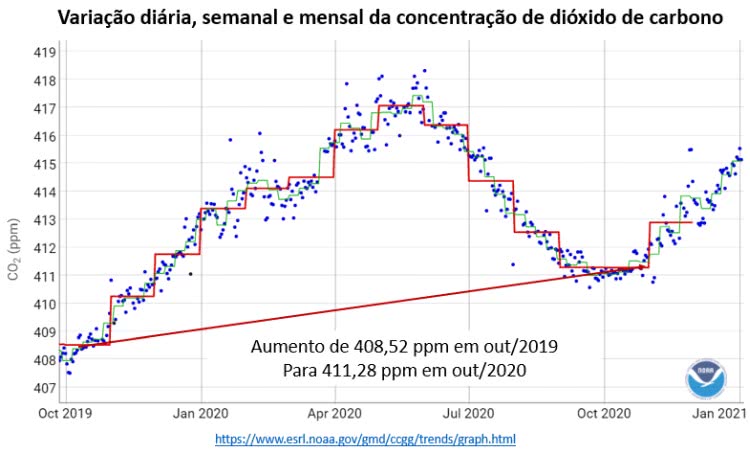 Normalmente, a concentração de CO2 aumenta de setembro a maio e tem uma queda entre maio e setembro de cada ano, como mostra o gráfico abaixo da NOAA. Entre outubro de 2019 e outubro de 2020 o aumento da concentração foi de 2,76 ppm, mesmo com as quarentenas e a redução das atividades econômicas globais.