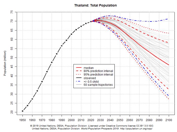 Como resultado, a população tailandesa que cresceu muito entre 1950 e 2020, passando de 20 milhões para 70 milhões de habitantes, estava estimada para iniciar uma fase de decrescimento a partir da década de 2030, podendo chegar a cerca de 45 milhões de pessoas em 2100, conforme mostra o gráfico abaixo da Divisão de População da Onu (projeções de 2019).
