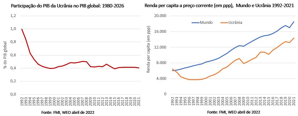 Após o fim da URSS, a Ucrânia passou por um período de crise econômica e a participação do PIB ucraniano no PIB global caiu de 1% para 0,4% (gráfico do lado esquerdo). A renda per capita da Ucrânia (em preços correntes em poder de paridade de compra) estava em torno de US$ 7 mil no início da década de 1990, caiu para cerca de US$ 4 mil na virada do milênio e, em 2021, estava em torno de US$ 14 mil, ficando abaixo da média mundial durante os últimos 30 anos (lado direito). Com a guerra, a renda per capita deve cair bastante em 2022 e nos anos seguintes, até haver uma retomada em algum momento.