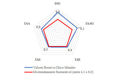 A partir da Figura 1 é possível visualizar os valores em uma escala moderada (cor vermelha) e os valores da Resex Chico Mendes (cor azul). Vê-se que quanto mais distantes os valores estiverem do losango vermelho, melhor é o nível de sustentabilidade dos indicadores. Então, é possível concluir que os indicadores com melhor performance na Resex Chico Mendes são o de Governança e o Agronômico, e os indicadores Econômico, Social e Ambiental apresentaram valores muito próximos da escala moderadamente sustentável, necessitando portanto de ações e políticas destinadas à superação destas lacunas (Lima et al., 2023).